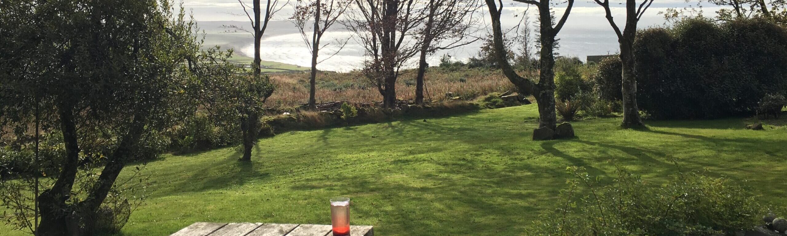 Stunning views were exposed only in the last few years since the National Trust felled the forest and replanted with native species. The native saplings grow beyond the garden towards the bay. So every year the view changes.